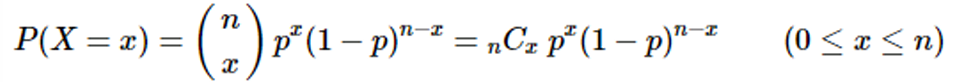 - n : 시행 횟수, x : 성공 횟수, p : 성공 확률
