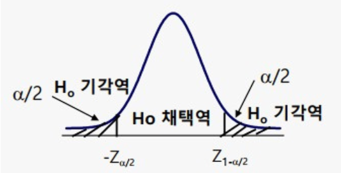 - 기각역이 각각 왼쪽과 오른쪽 두 부분으로 구성된 가설검정