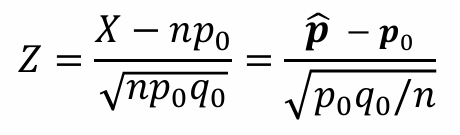 X ~ B(n, p)를 따르고, 표본 크기 n이 충분히 크고 np0 ≥ 5, nq0 ≥ 5일 때, 모비율에 관한 검정통계량