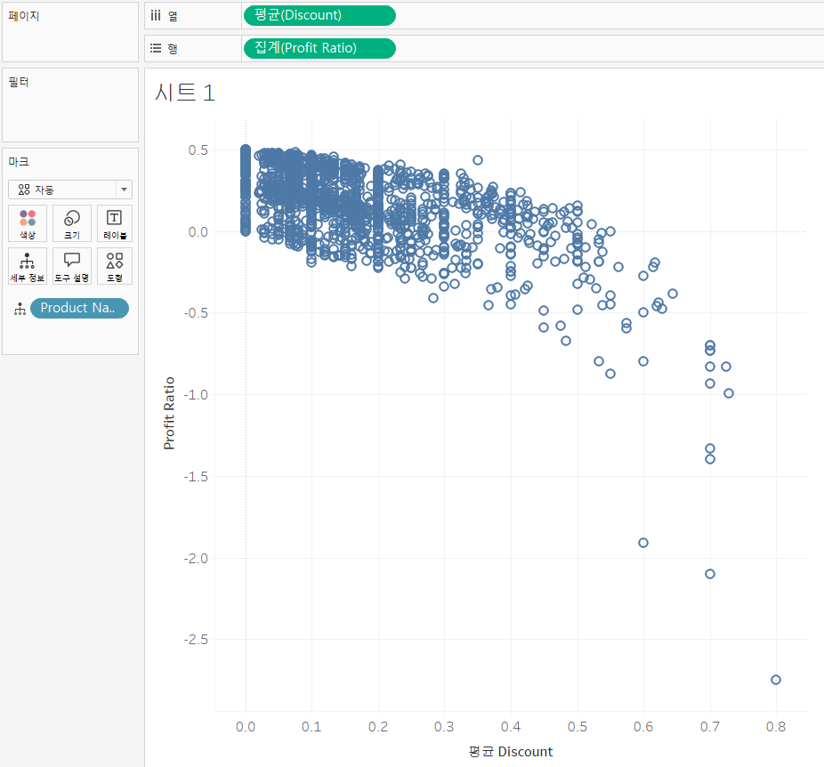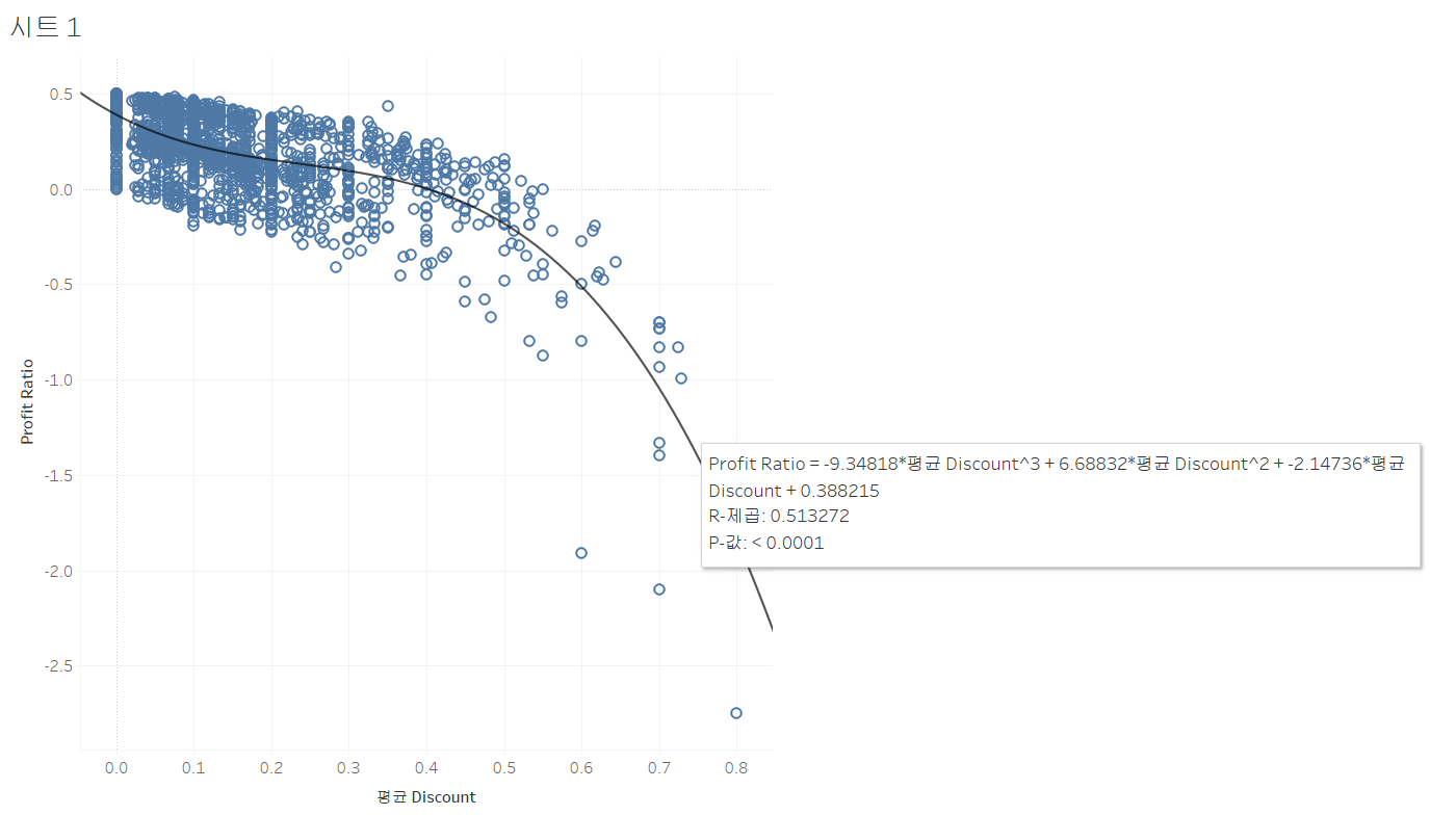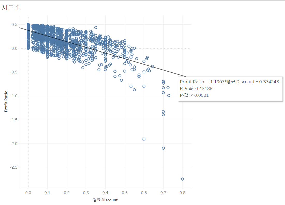 역시 할인을 많이 할 수록 제품들의 수익률이 떨어지는 것을 확인할 수 있다. 팔면 팔수록 손해를 보는 제품이 존재한다.