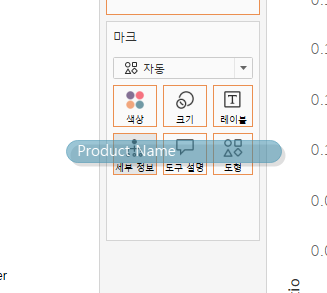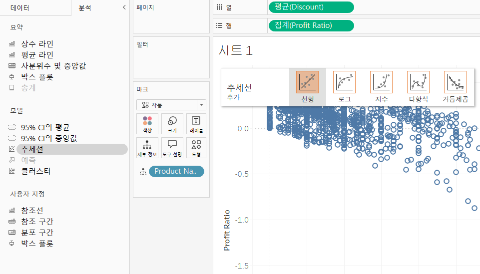 정리 : 두 개의 측정값 사이의 상관관계를 보기 위해 분기(Product Name 필드로)를 해주었다. 마지막으로 분석 패널의 추세선을 삽입해 주었다.