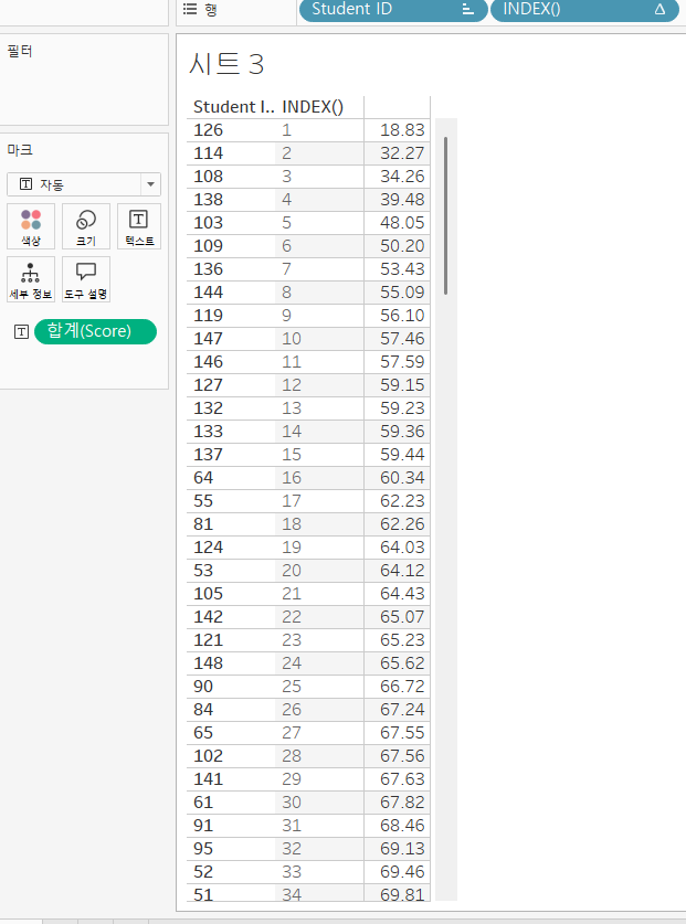 오름차순 상태이기 때문에 Score가 가장 낮은 학생이 INDEX() 필드에선 1로 되어있는 것을 확인할 수 있다.