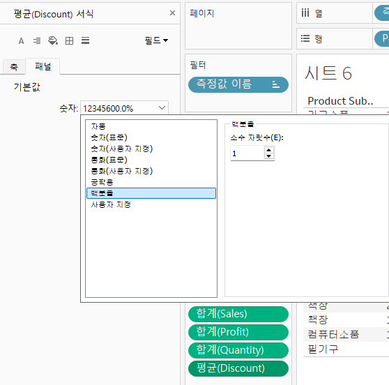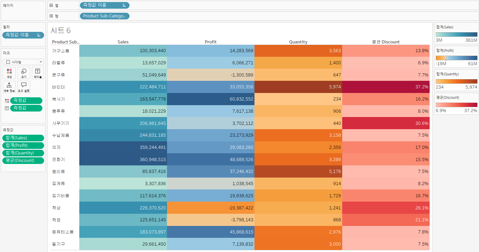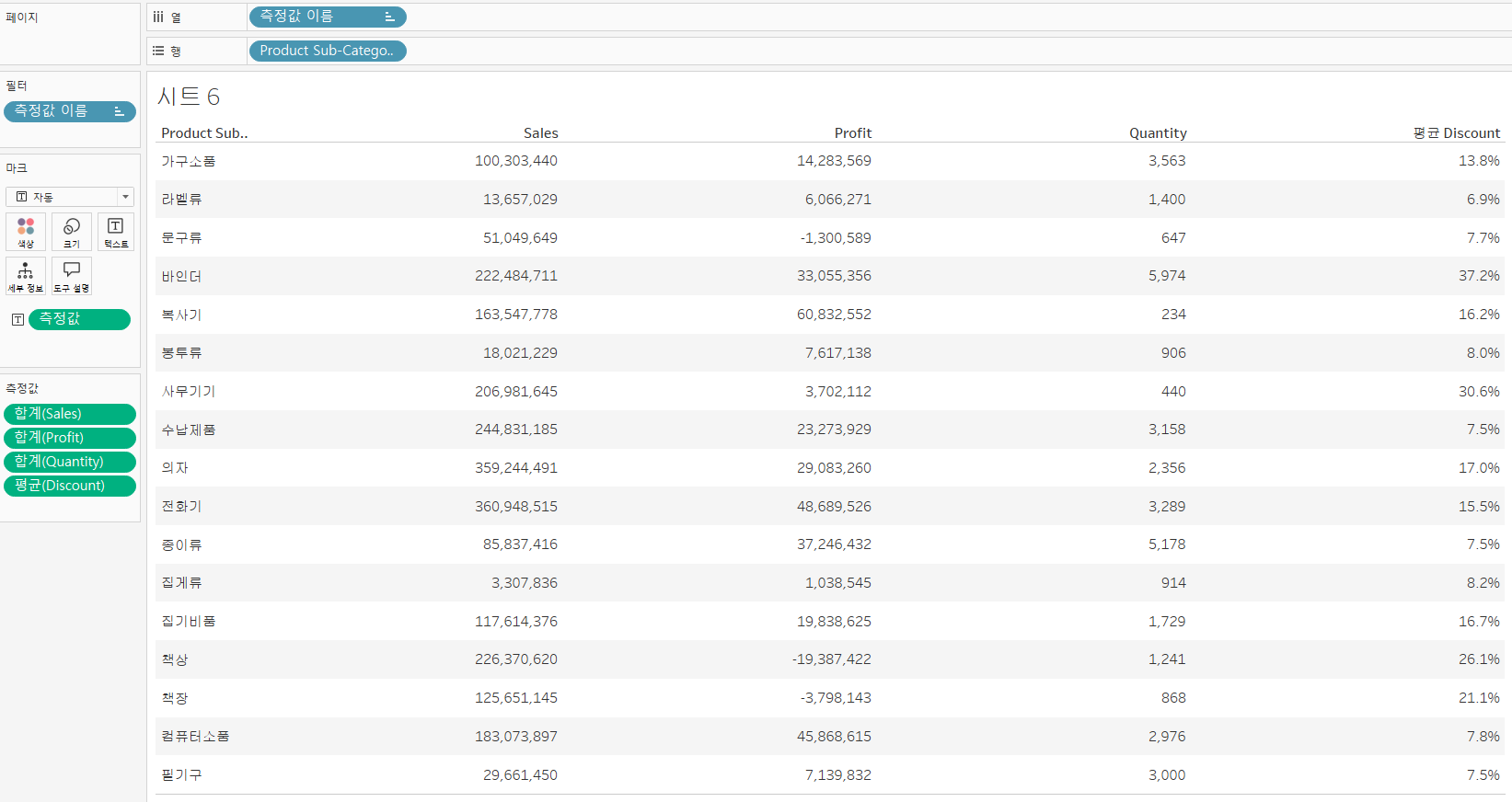 Product Sub-Category를 행에, Sales를 마크 텍스트에, Profit을 합계(Sales) 열 옆에다 드랍한다.