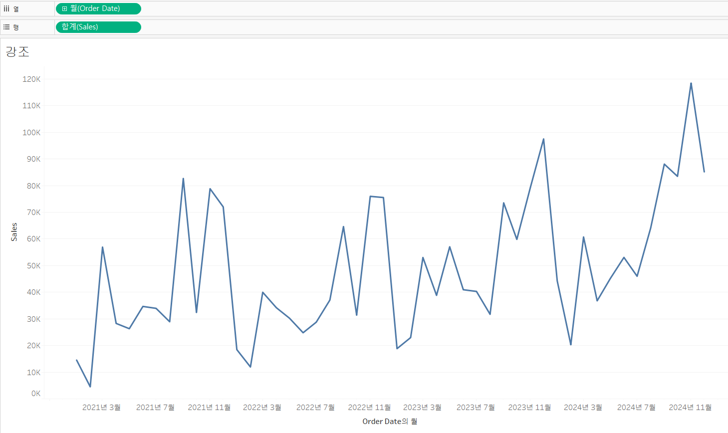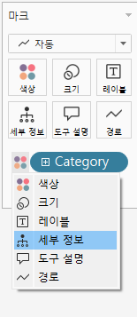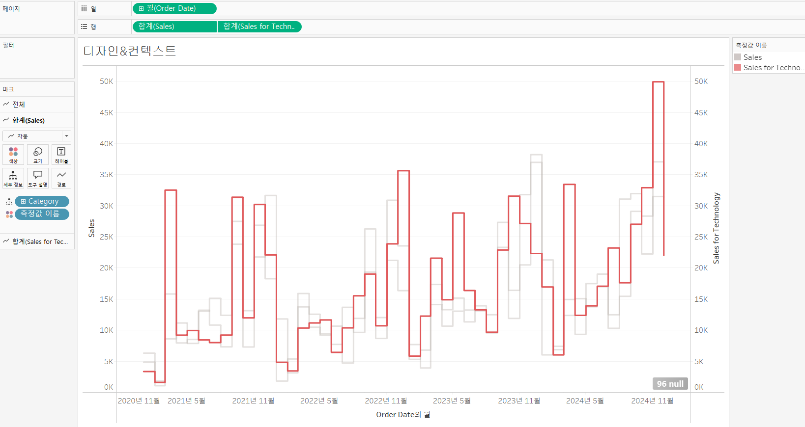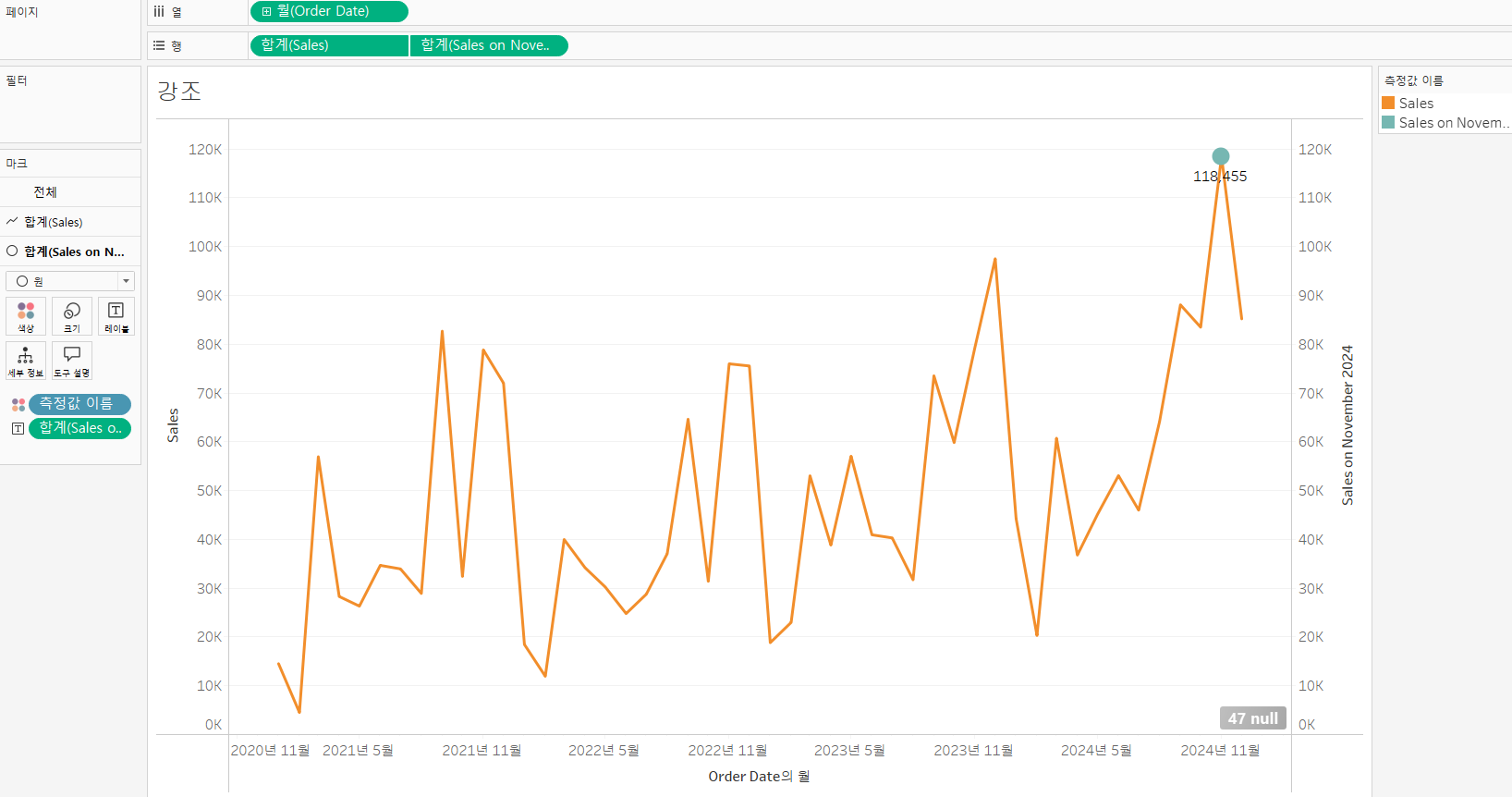 정리 : 강조하고 싶은 별도의 측정값을 만들어주고, 이중축을 생성하고, 마크와 레이블을 사용하면 특정 부분이 강조된다.