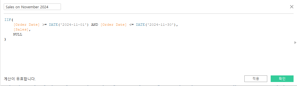 계산된 필드를 하나 만들어 주자.(2024년 11월달의 Sales 금액을 가져온다.)
