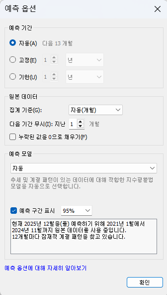 예측을 집어넣고, 위와 똑같이 지난 기간 무시를 0으로 설정하게 되면