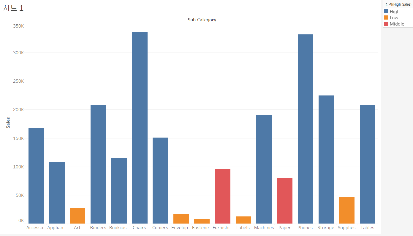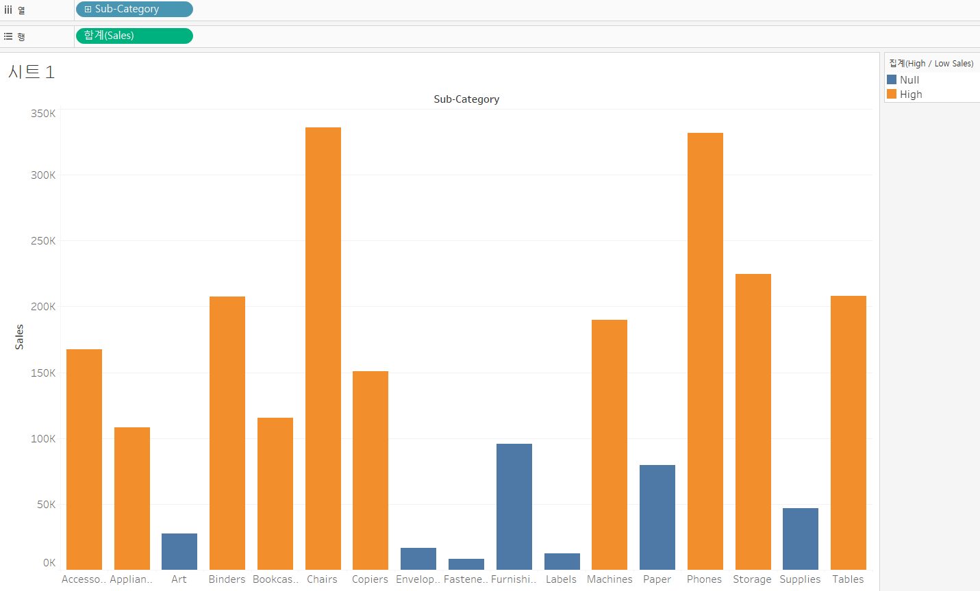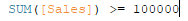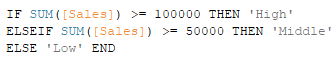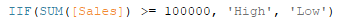 IF SUM([Sales]) >= 100000 THEN 'High' END