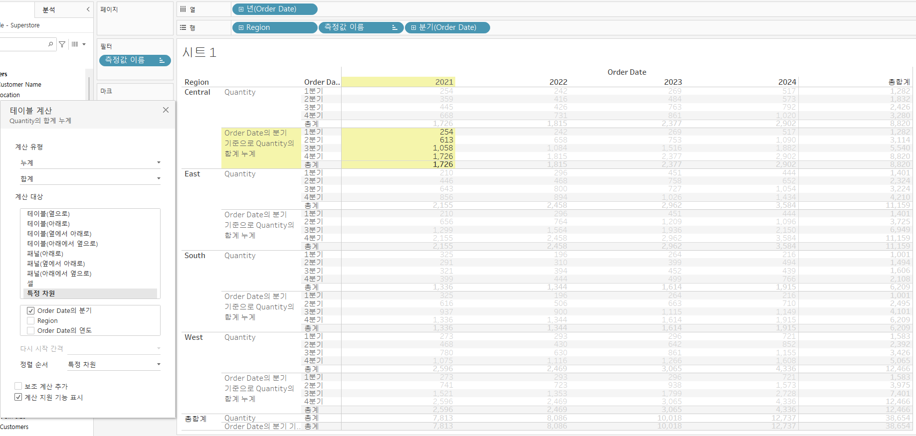 '특정 차원'이 아닌 계산 대상들은 이 화면에 잡혀있는 위치(Region은 행 선반 / 연도와 분기는 열 선반)를 기반으로 테이블 계산을 수행한다. 이 위치를 옮기게 되면 테이블 계산의 결과는 완전히 바뀐다.(옆으로/아래로는 상대적인 개념이기 때문)