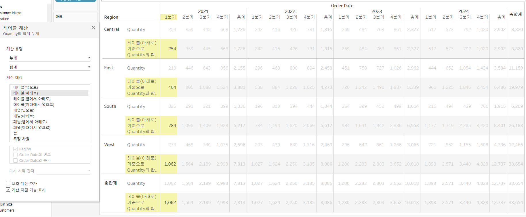 각 지역별로 Quantity가 Running Sum(누계) 되어지고 있다.