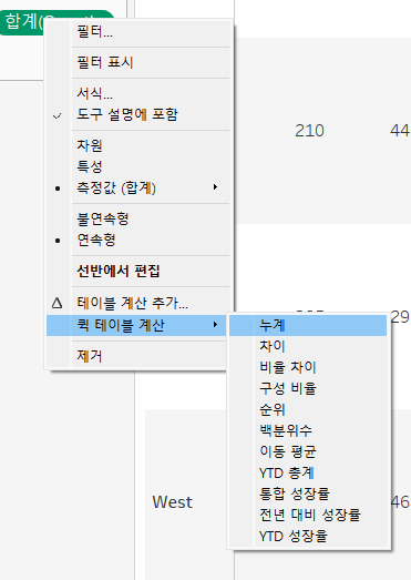 계산 유형에서 태블로가 제공하고 있는 퀵 테이블 계산 패키지들을 확인할 수 있다.(누계, 비율, 구성비율 등)