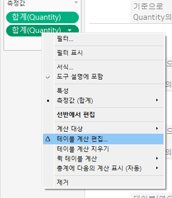 퀵 테이블 계산되어 있는 필드에서 -> 테이블 계산 편집