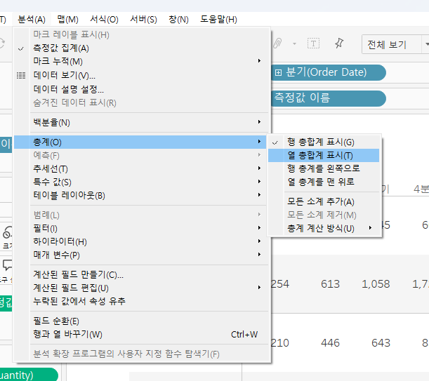 분석 - 총계 - 행/열 총합계를 표시 & 모든 소계 추가