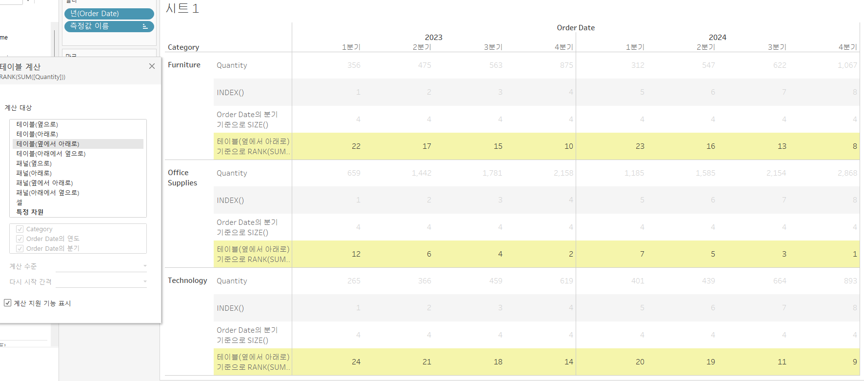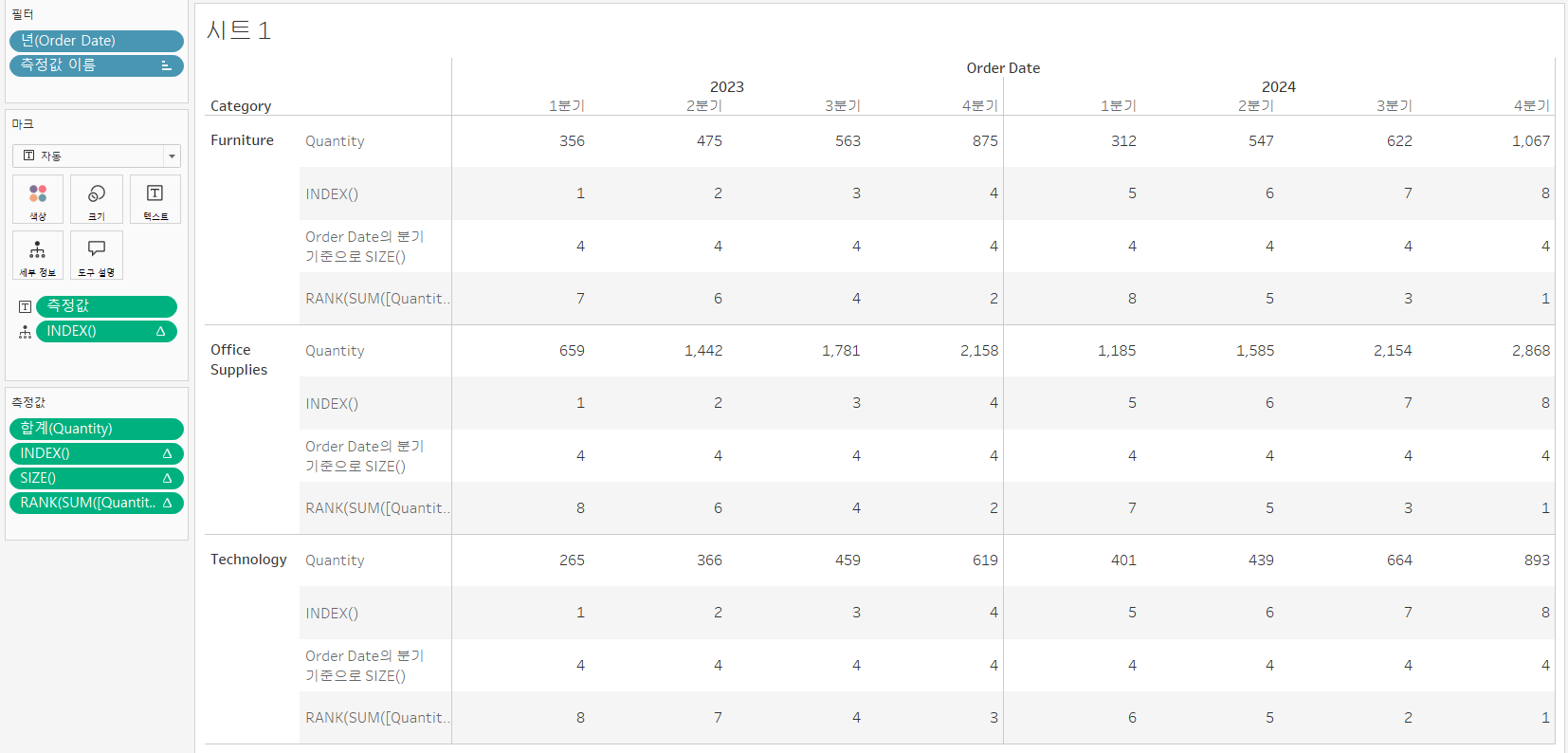 지금은 Category 별로 '합계(Quantity)' 에 따라 순위가 매겨진 것을 확인할 수 있다.