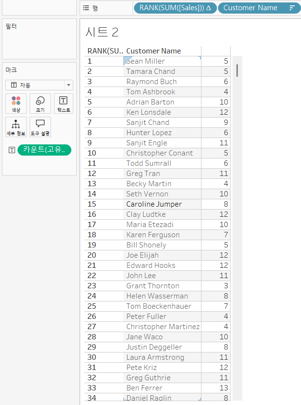 Sean Miller의 경우 sales 기준으로는 1위이지만, 주문횟수(카운트(고유 order id))는 5번 뿐인 것을 알게 된다.