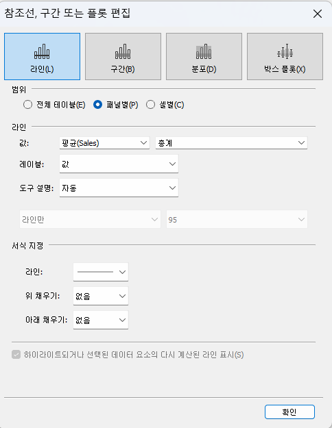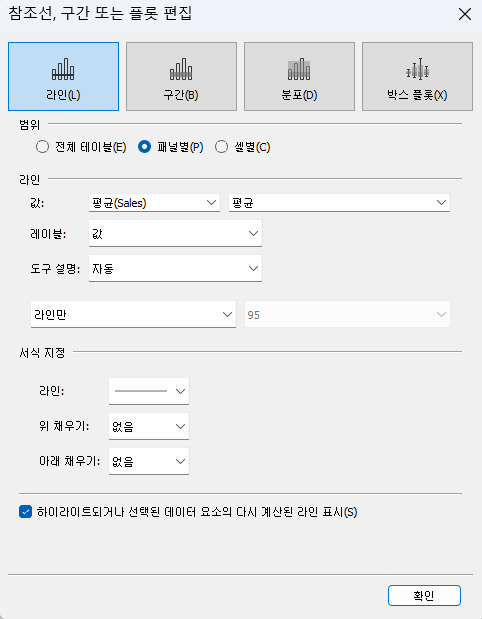 만약 카테고리가 화면 안에 들어가 있으면, 분석 탭 -> 평균 라인 -> 패널 로 집어넣어 평균값을 구할 수 있는데