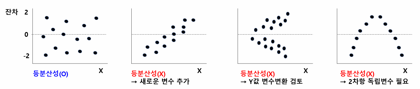 - 잔차가 직선의 형태를 띄어야 함(그렇지 않으면 정규성 위배)