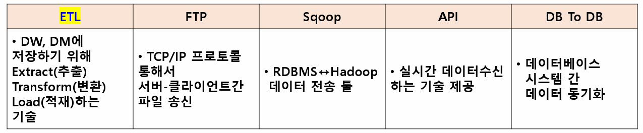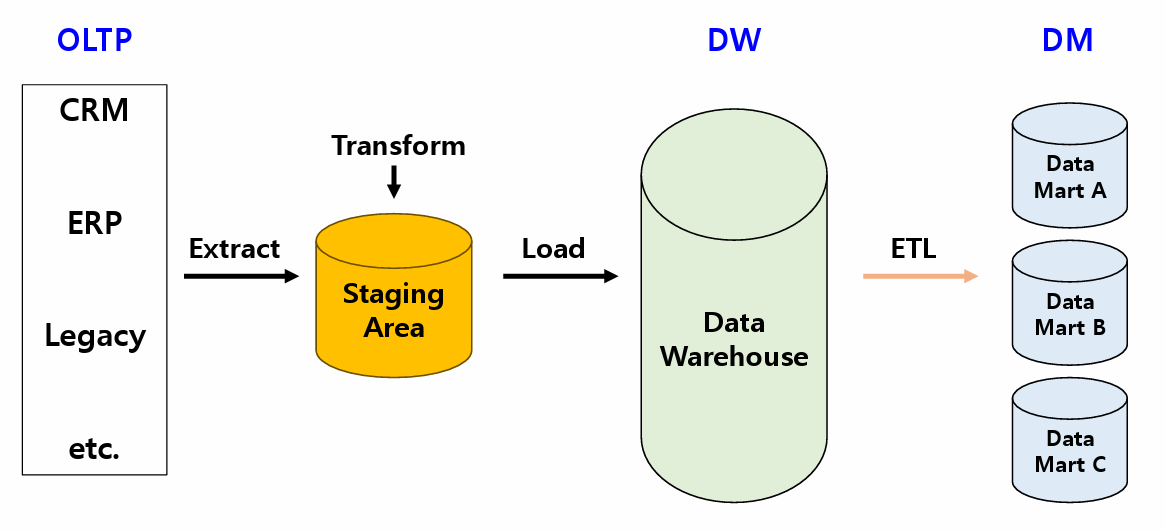 - ETL : DW, DM에 저장하기 위해 Extract(추출), Transform(변환), Load(적재) 하는 기술