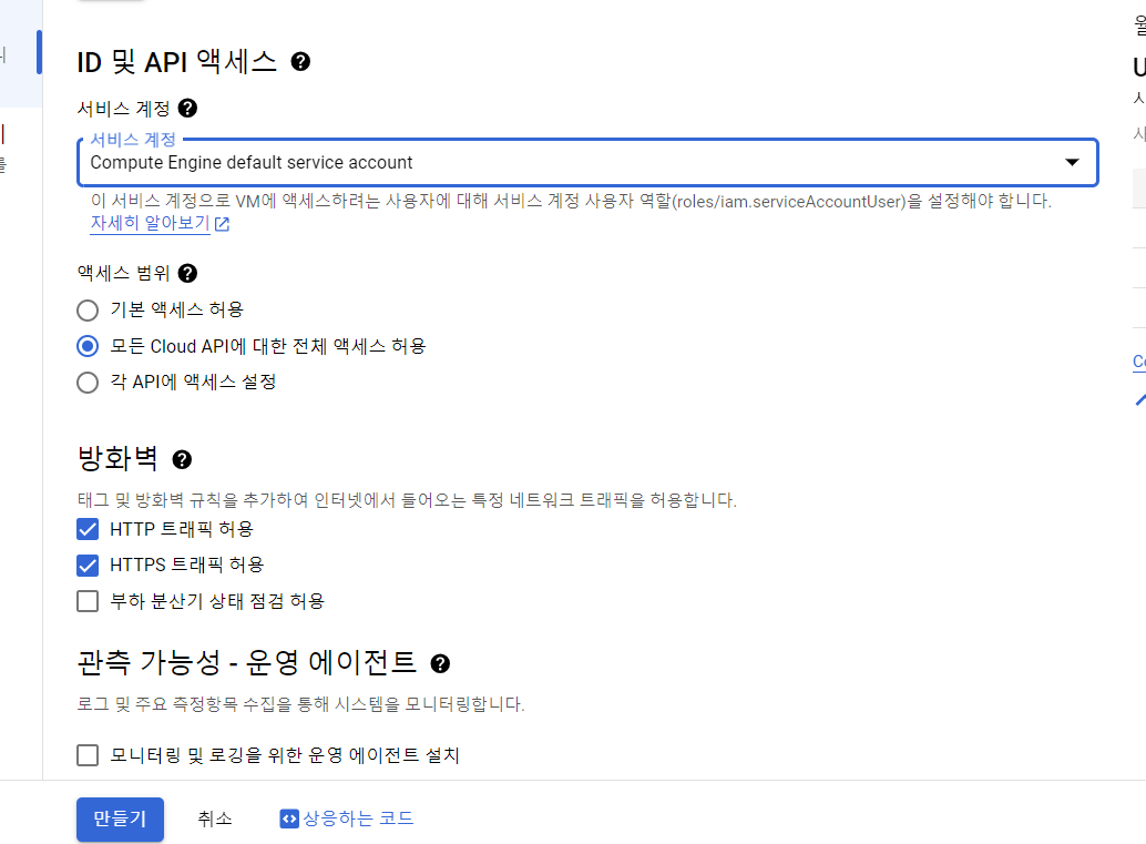 - 모든 Cloud API에 대한 전체 엑세스 허용 -> HTTP 트래픽 허용 -> HTTPS 트래픽 허용 -> 만들기