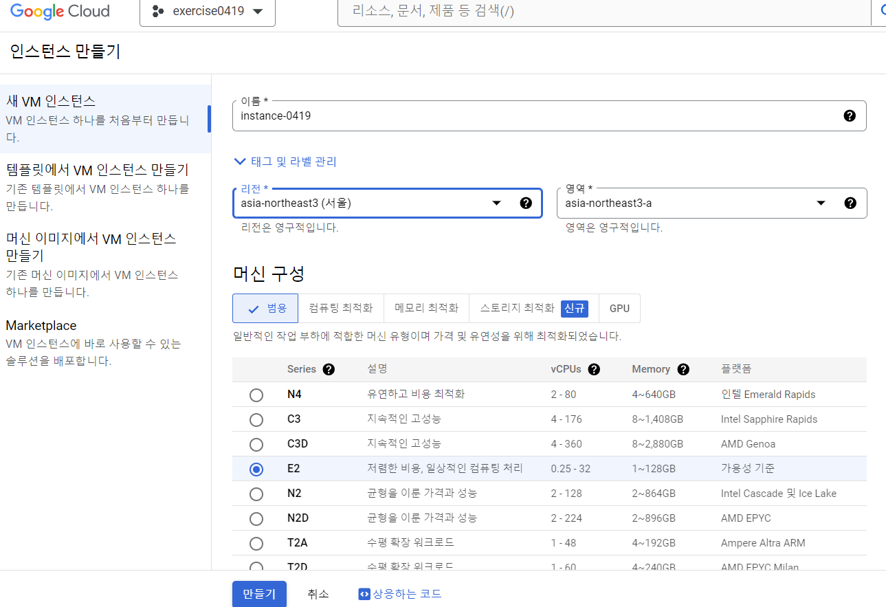 - Compute Engine -> VM인스턴스 -> 인스턴스 만들기