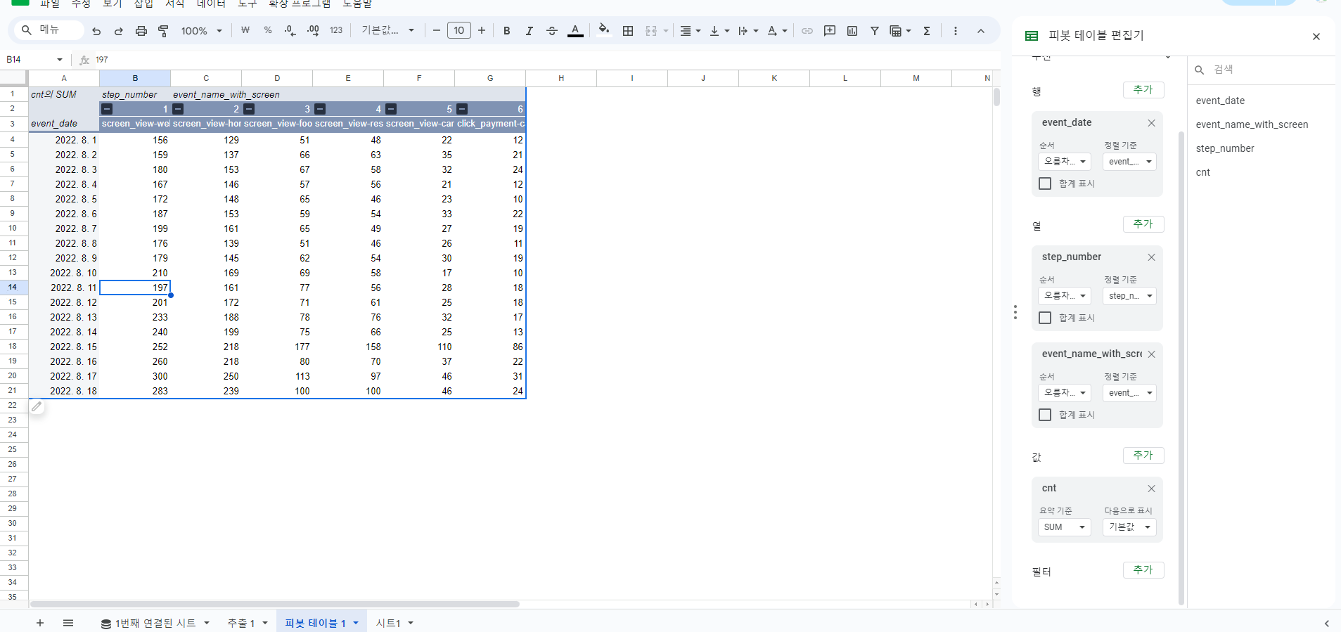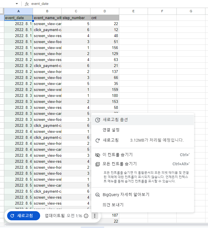 일자별로 퍼널을 집계한 쿼리를 실행 -> 데이터 탐색 -> 스프레드시트로 탐색