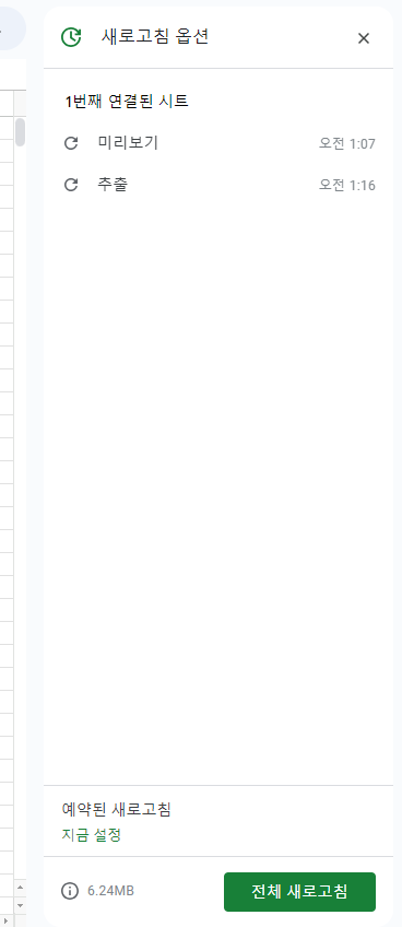 새로고침 옵션에 미리보기 외 추출이 생김