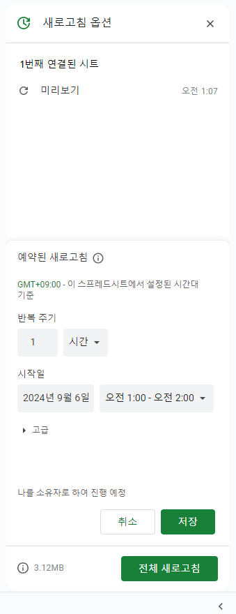 데이터 좌측 아래에 새로고침 아이콘 -> 새로고침 옵션