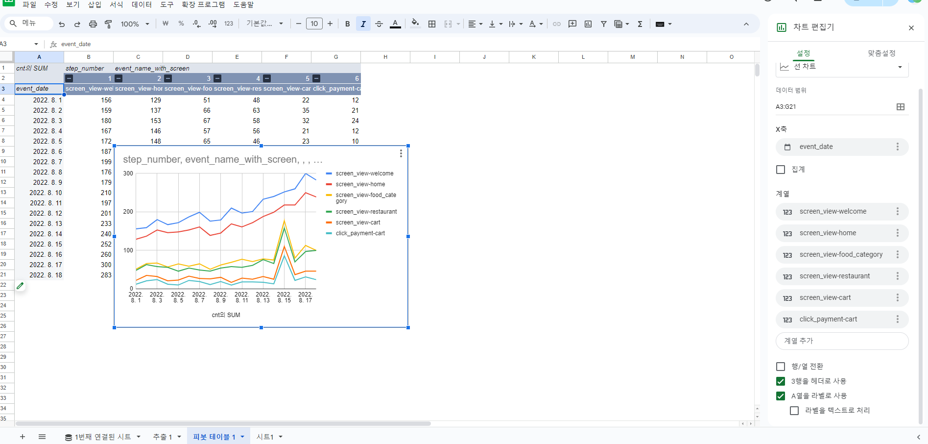 차트 편집기로 차트 및 X축 등을 수정해도, 이 형태에선 데이터 시각화가 어려움(피봇 필요)