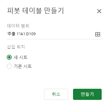 데이터를 선택한 후 -> 삽입 -> 피봇 테이블