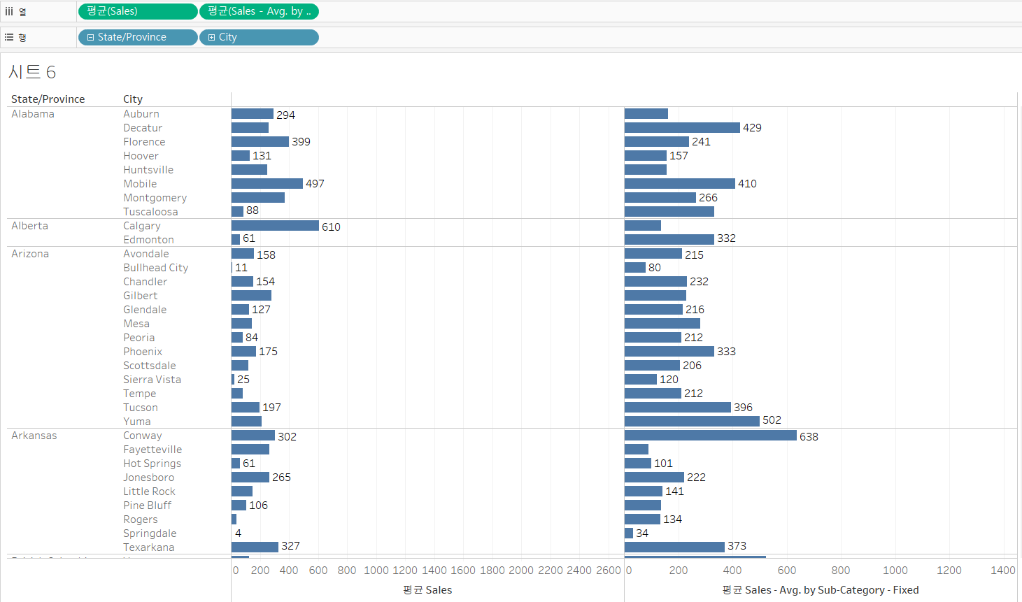 Case 2. Fixed LOD에서 선언한 차원이 VLOD에 포함되어 있지 않을 때우측 값은 어떻게 나온 것일까? 과정을 처음부터 살펴보자.현재 상태에서 Fixed LOD(=서브카테고리 레벨에서 평균 Sales가 집계됨)를 안으로 집어넣는다면1차 계산이 먼저 이루어지고, 현재의 VLOD 레벨(=City)에서 Fixed LOD에서 선언한 차원(=서브카테고리)이 포함된이 화면에서 태블로는 측정값이 존재하는지 아닌지 확인하게 된다.예를 들어, Alabama 주의 Auburn이라는 도시에서는 17개의 서브카테고리 항목 중에서 Art, Chairs, Envelopes, Labels, Paper, Storage 이렇게 6개의 항목에 대해서만 서브카테고리 값을 가지고 있다.이 6개의 1차 계산 결과에 대해서만 2차 ..